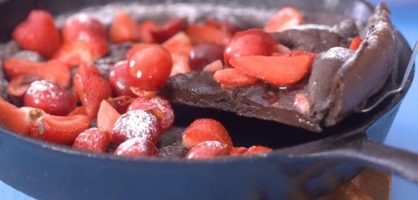 Zagrejte rernu na 220°C, pa unutra stavite tiganj na minimum 8 minuta. U činiji umutite jaja sa šećerom, ekstraktom vanile i soli. Dodajte prosejano brašno i kakao, pa mešajte dok se sastojci ne sjedine. Postepeno sipajte mleko i sve vreme mešajte. Dodajte puter u zagrejani tiganj i vratite u rernu na minut, dok se puter potpuno ne istopi. Zatim sipajte testo u tiganj i vratite u rernu na 15 minuta. Ukrasite voćem i šećerom u prahu, pa služite.