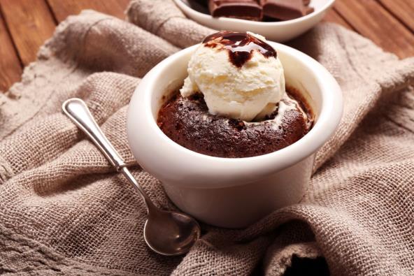 Na kraju umešajte sve suve sastojke i dodajte komadiće tamne čokolade. Pecite u mikrotalasnoj rerni 1 minut, izvadite, dodajte malo sladoleda od vanile i uživajte. Možda ćete poželeti da napravite i čokoladni kolač od 2 sastojka.