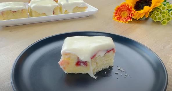Zagrejte džem od jagoda i dodajte mu dve kašike brašna, pa dobro promešajte. Stavite na stranu. Tepsiju veličine 20x20 cm obložite papirom za pečenje. Izlijte smesu u nju. Na vrh smese kašikom sipajte mešavinu džema i napravite šaru. Pecite u prethodno zagrejanoj rerni na 170 stepeni C 30-35 minuta. Ostavite da se ohladi pa prelijte glazurom i ostavite da se stegne. Servirajte i uživajte. Možda ćete želeti da napravite i lagani osvežavajući kolač sa kremom i kupinama.