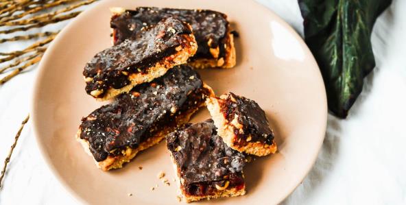 U međuvremenu, napravite preliv tako što ćete na pari da otopite čokoladu i kokosovo ulje, povremeno mešajući, dok se ne istopi. Sipajte preko kolača i lopaticom izravnajte površinu. Udarite pleh o radnu površinu. Pospite preko toga kakao, 20 g pečenog kikirikija i 1/2 kašičice slanih pahuljica. Ohladite 30 minuta ili dok se ne stegne. Isecite i servirajte. Možda ćete želeti da napravite i hladne praline od sira prelivene čokoladom sa lešnicima.