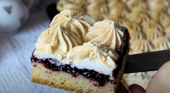 Prebacite beze u vrećicu za ukrašavanje sa mlaznicom. Preko ohlađenog testa premažite džem, pa odozgo pravite ukrase od bezea. Pecite kolač u zagrejanoj rerni na 160 C oko 45 minuta, u skladu sa rernom, i pazite kako se gornji sloj suši. Ohladite kolač i servirajte. Možda ćete želeti da napravite i sočni kolač natopljen rumom.