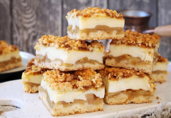 Kako biste napravili ovaj kolač, za testo pomešajte brašno, prašak za pecivo, puter, prstohvat soli, žumanca i 40 g šećera dok ne dobijete glatko testo. Utisnite u kalup za pitu prečnika 20 cm, ili u četvrtasti kalup. Za sloj od jabuka naseckajte jabuke i pomešajte ih sa 40 g šećera i limunovim sokom. Ređajte ih na testo.