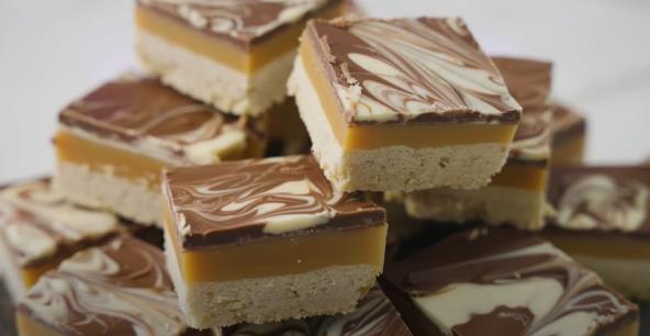 Smesa će biti gotova kada se promeni u nešto tamniju zlatnu boju i zgusne do meke teksture. Sipajte karamel na koru kolača i ostavite da odstoji sat vremena u frižideru. Kada se stegne, istopite odvojeno mlečnu i bleu čokoladu i prelijte karamel, šarajući ih čačkalicom. Ohladite kolač u frižideru još 1-2 sata dok se čokolada ne stvrdne. Možda ćete želeti da napravite i mikado kocke sa ukusom kafe.