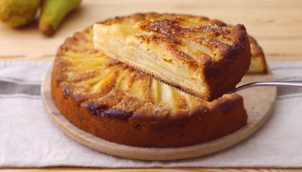 Sipajte testo u kalup obložen papirom za pečenje. Po vrhu poređajte preostale kriške kruške u kružnom obliku i pospite šakom smeđeg šećera. Pecite na 180°C oko 45 minuta.