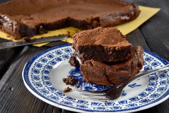 U velikoj posudi snažno umutite žumanca i 107 grama šećera dok ne postanu kremasti, oko 30 sekundi. Dodajte čokoladnu mešavinu i umutite dok ne postane homogena. Dodajte bademovo brašno i so, a zatim umutite dok se potpuno ne sjedini. Umutiti i rum i stavite na stranu.