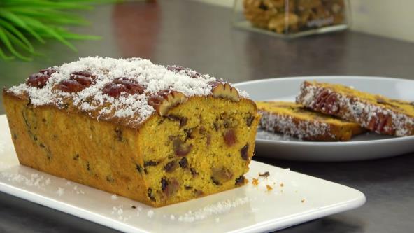U posebnoj posudi sjedinite bademovo i pirinčano brašno, steviju, prašak za pecivo i cimet. Spojite suve i vlažne sastojke i mešajte dok ne dobijete ujednačeno testo. Sipajte testo u pleh obložen papirom za pečenje. Odozgo stavite pekan orahe. Pecite u prethodno zagrejanoj rerni na 180 °C oko 50 minuta, dok ne porumeni i zamiriše. Gotov kolač premažite javorovim sirupom i pospite kokosovim čipsom za svečani dodir.
