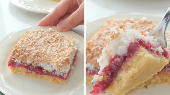 Nakon toga napravite beze. Umutite belanaca. Dodajte im so i šećer i nastavite da mutite. Zatim u smesu sipajte kokosovepahuljice. Sve dobro izmešajte kutlačom pa rasporedite preko džema od malina na kolač. Pecite u rerni zagrejanoj na 170 stepeni oko 40 minuta. Uživajte. Možda ćete želeti da napravite i brz i lak voćni kolač.