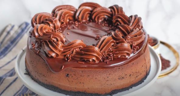 Pripremite na kraju čokoladni ganaš. Stavite čokoladne komadiće u posudu i dodajte slatku pavlaku. Zagrejte čokoladu i pavlaku na laganoj vatri. Mešajte ih, nastavljajući da zagrevate, dok se čokolada potpuno ne otopi i ne postane glatka. Kada se čizkejk stegne preko noći, pažljivo otpustite kalup i stavite tortu na postolje. Prelijte ganaš preko torte, a zatim ga rasporedite po ivicama. Vratite tortu u frižider na oko 20 minuta da se čokolada stegne pre nego što dodate čokoladni krem. Ubacite čokoladni krem u poslastičarsku kesu i ukrasite čizkejk. Uživajte. Možda ćete želeti da napravite i Bejlis čizkejk.