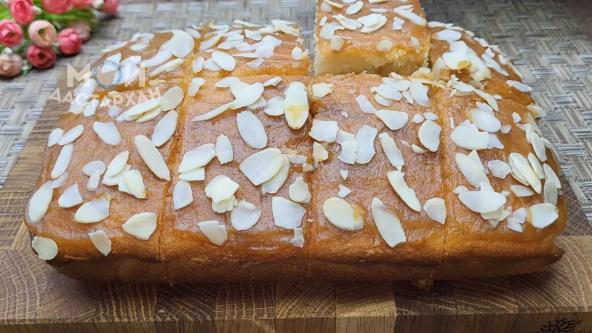 Umutite jaja sa šećerom, vanilin šećerom i solju. Dodajte kefir i ulje, pa dobro promešajte. Postepeno umešajte brašno pomešano sa praškom za pecivo dok ne dobijete glatku smesu. Sipajte smesu u kalup obložen papirom za pečenje. Pecite u prethodno zagrejanoj rerni na 180°C oko 30–35 minuta (proverite čačkalicom). Gotov kolač premažite džemom i pospite listićima badema ili seckanim orasima po želji.