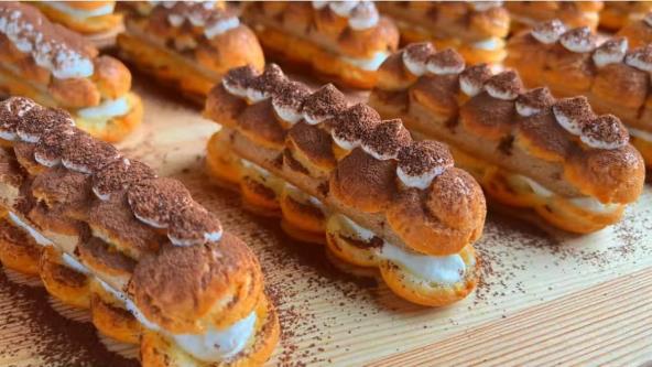 Spoj dva klasika – nežni ekleri punjeni kremom od maskarponea i kafe – pravi su izbor za one koji vole bogate poslastice. Hrskavo testo, kremasti fil i prepoznatljiv ukus tiramisua čine ih savršenim desertom za posebne prilike, ali i svakodnevne trenutke uživanja.