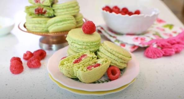 Kore makarona potpuno ohladite pre nego što dodate fil i sklopite ih. Uparite kore makarona po veličini i okrenite pola kora. Na svaku polovinu stavite izdašan špric glazure, ostavljajući mali otvoreni prostor u sredini za bobice. U sredinu stavite maline, zatim prekrijte drugom korom i spojite kolačiće. Servirajte i uživajte. Možda ćete želeti da napravite i francuske makarone.