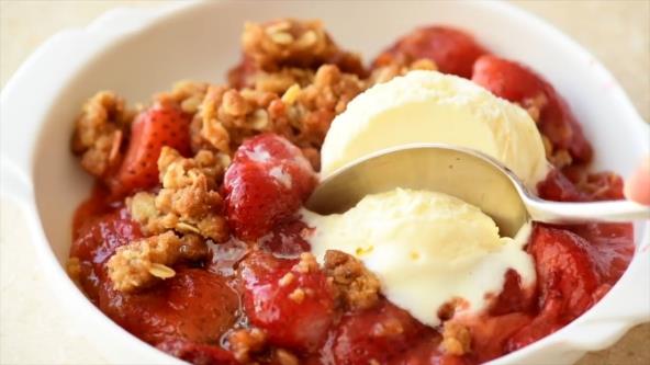 Sipajte jagode u podmazan pleh ili vatrostalnu posudu. Preko rasporedite mrvičasti preliv, prstima ga usitnite tako da ostane neravnomerno – to daje šarm. Pecite 30–40 minuta, dok gornji sloj ne porumeni, a fil ne kipi uz ivice. Ostavite da se malo prohladi pa služite toplo uz kuglu sladoleda ili preliv po želji.