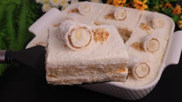 Piškote kratko umočite u kokosovo mleko i poređajte na dno kalupa. Preko nanesite polovinu fila, poravnajte, pa stavite novi sloj umočenih piškota. Završite ostatkom fila i sve lepo poravnajte. Pospite sušenim kokosom i dekorišite polovinama rafaelo kuglica i seckanim lešnicima ili bademima.