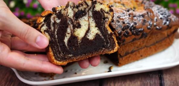 U podmazan i pobrašnjen kalup sipajte naizmenično belu i tamnu smesu da dobijete šare. Pecite u prethodno zagrejanoj rerni na 180 °C oko 35–40 minuta, dok čačkalica ne izađe suva.