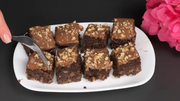 Otopite čokoladu sa uljem na pari ili u mikrotalasnoj. Prelijte ohlađeni kolač i poravnajte. Pospite seckanim orasima. Kada se glazura stegne, isecite na kocke i poslužite.