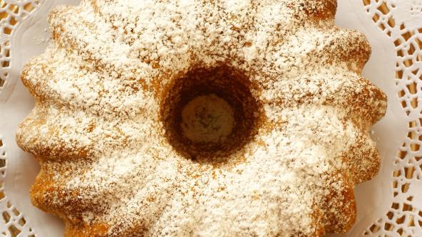 Izvadite kuglof iz rerne, ostavite ga da se malo prohladi, zatim pažljivo izvadite iz kalupa. Po želji pospite šećerom u prahu.