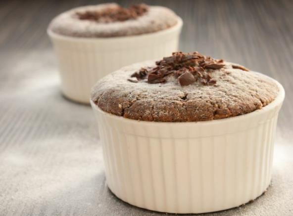 3. Smesu razliti u činijice (ne do vrha već malo više od polovine). Peći na 170 °C oko 35 minuta. Kada je sufle gotov posuti prah šećerom i ukrasiti krupno rendanom čokoladom.