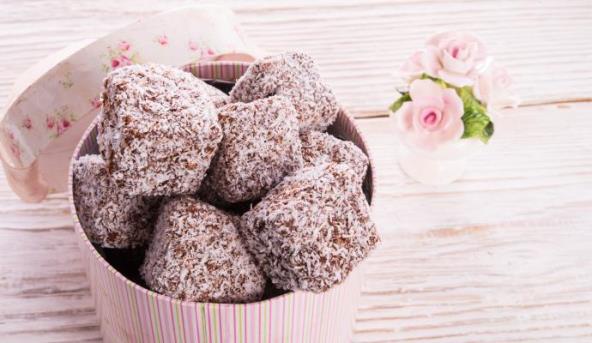 5. Kada se testo ohladi, isecite ga na kockice, umačite u mlaku glazuru i uvaljajte u kokos.