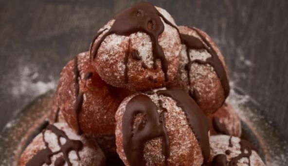 3. Pržene krofnice izvadite na kuhinjski ubrus da se ocede od viška ulja. Oceđene, neposredno pre nego ćete vaditi novu turu, prebacite u posudu za serviranje i pospite šećerom u prahu i prelijte topingom od čokolade.