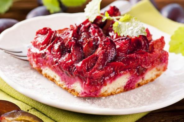 2. Sipati testo u nauljeni kalup za kolače (ø 26 cm). Posuti prezlama. Podesiti rernu na 180 stepeni. Očistiti šljive, preseći na polovine i poređati po testu. Peći oko 45–50 minuta.