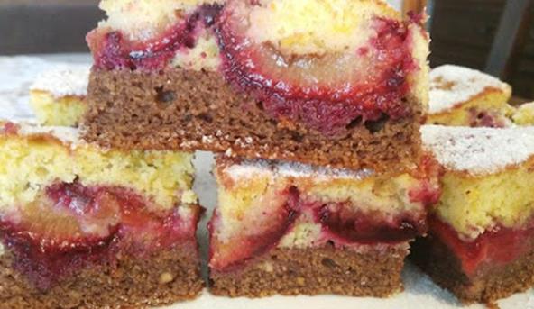 3. Izvadite kolač posle 5 min. pa poređati šljive koje ste prethodno isekli na pola i normalno odbacili koščice. Preko šljiva sipajte malo cimeta.
