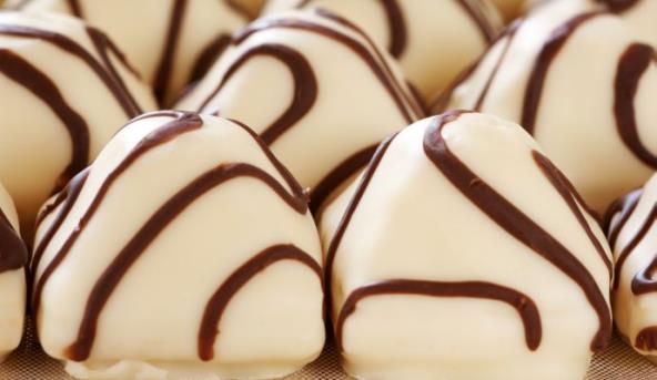 2. Testo dobro umesiti. Praviti kuglice pa ostaviti jedan dan da se osuše i tek onda ih umakati u rastopljenu belu čokoladu. Ostaviti u frižideru da se ohlade.