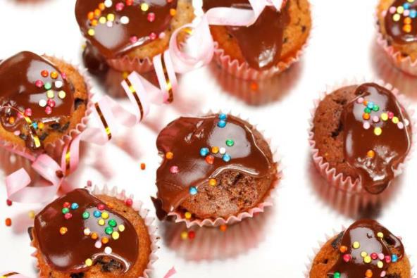 2. U specijalni pleh za krofnice, sa 12 rupa ili još bolje sa 24 (biće sitnije), staviti papirne korpice, pa napuniti testom, tako da budu pune do 3/4 zapremine. Peći u prethodno dobro zagrejanoj rerni oko 15–20 minuta, tako da postanu zlatno rumene. Izvaditi krofnice iz pleha i sačekati da se ohlade na sobnoj temperaturi.