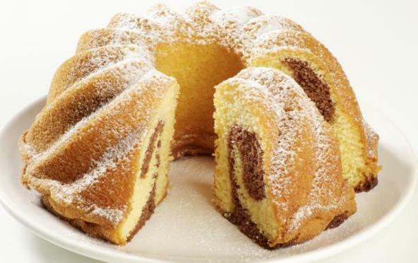 2. Pomešati cimet i ostatak šećera i dodati u polovinu testa. Kalup za kuglof nauljiti (nije loše posuti ga još prezlama). Razvaljati žuto testo, pa preko njega braon i uvaljati u rolat. Staviti ga u kalup za kuglof
