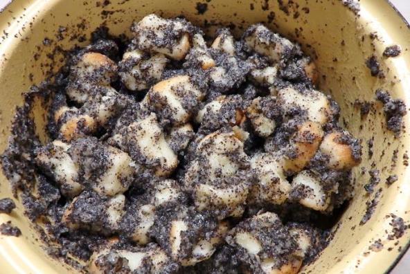 Pečeno testo prvo ohladite, zatim ga secite na komadiće oko 2 cm i spuštajte u prokuvanu vrijuću vodu i mešajte oko 5 minuta. Zatim ih procedite i premestite u drugu posudu. U takve još vruće bobaljke dodajte prethodno skuvan mak, a zatim sve prelijte medom i promešajte.