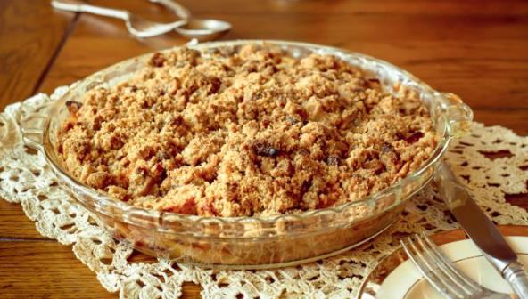 3. Za mrvice, pomešati u činiji maslac, brašno i šećer, dobro zamesiti, pa rukama praviti mrvice. Dodati sitno seckane bademe. Zatim mrvice ujednačeno rasporediti po kolaču. Kolač peći u rerni oko 35 minuta, pa ostaviti da se dobro ohladi. Pre serviranja, eventualno, posuti šećerom u prahu.