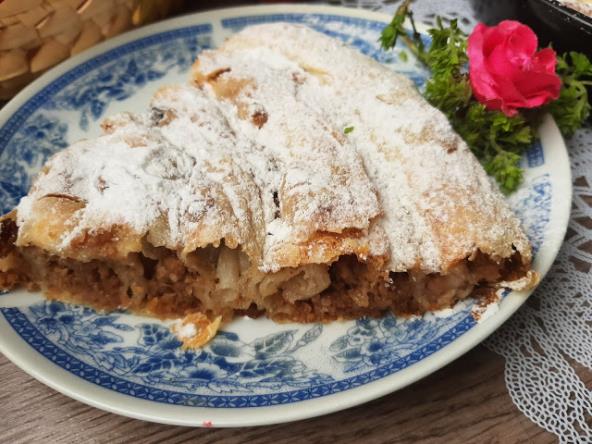 Zamesiti glatko testo od brašna, vode i soli. Malo razvući oklagijom, premazati uljem i ostaviti na stolu da se odmori oko 10-15 min. Razvući kao u Videu, pa razbacati orahe i jabuke. Pokidati krajeve i uviti do pola stola. I drugu polovinu pomoću stolnjaka uviti i preseći na pola nože. U veći podmazan okrugli pleh ređati u krug. Namazati dobro uljem sa svih strana i peći na 200°C oko 30-40 min. Pokriti krpom da omekne i posuti vanilin šećerom i prah šećerom.