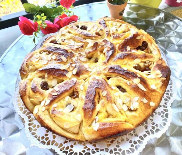 Zatim na svaku od traka dodavati prvo suvo groždje, zatim orahe i na kraju jabuke. Uviti u valjak, seći jufkice, položiti ih u pleh, premazati žumancem, posuti bademovim listićima, sačekati još 20 minuta da naraste i peći na 180 stepeni 30-35 minuta. Prijatno!
