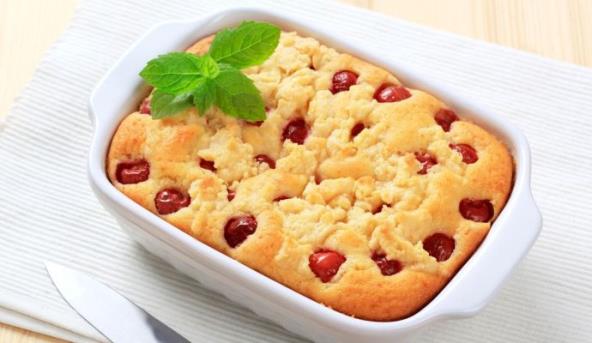 1. Rernu zagrejati na 180 stepeni. Sipkavo testo razviti po dubokom plehu obloženom peki papirom i pritom napraviti ivice. Kompot od višanja rasporediti po plehu i preko premazati smesu sa sirom. Peći u rerni oko 45–50 minuta.