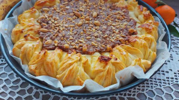 Pogaču staviti u tepsiju sa pek papirom. Sredinu napuniti kremom u koji ste ubacili krupno seckan kikiriki. Ostaviti da malo naraste pokrivena pa premazati žumancetom pa naraslu pogaču pitu peći na 180 stepeni C oko 40 min. Pokriti 10 min da se odmori.
