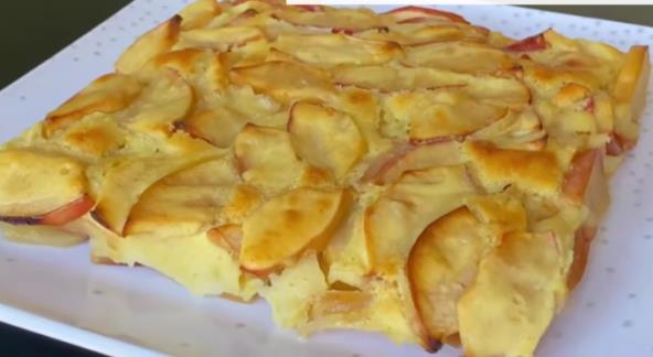 Jabuke očistite od koštice i isecite na kriške. Prelijte sa malo limunovog soka. Dno kalupa obložite pek papirom, a ivice premažite maslacem. Sipajte jabuke, a zatim jaja umutite sa šećerom, pa dodajte mleko sobne temperature i prosejano brašno. Posle svakog dodavanja umutite. Sipajte preko jabuka i pecite 40 minuta na 190°C. Pospite šećerom u prahu.
