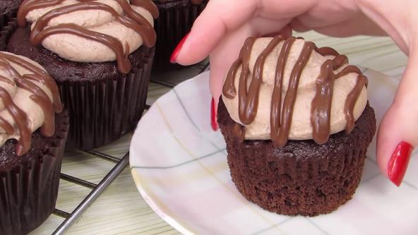 Prosejte brašno, kakao i so. Dodajte šećer i promešajte. Zatim dodajte jaja, ulje, vodu i kafu. Sjedinite. Na kraju dodajte sodu i prašak za pecivo. U kalup za mafine stavite paprine kalupe i sipajte smesu do polovine. Pecite na 180°C nekih 15-20 minuta. Otopite čokoladu, pa pomešajte sa slatkom pavlakom ili otopite zajedno. Kada se skroz ohladi, na vrhu na sredini mafina napravite rupu i sipajte punjenje. Krem sir pomešajte sa prosejanim šećerom u prahu i kakaom. Sjedinite, pa umutite da postane kremasto. Sipajte u špric za kolače i stavite na vrh mafina. Možete da dekorišete istopljenom čokoladom ako želite.