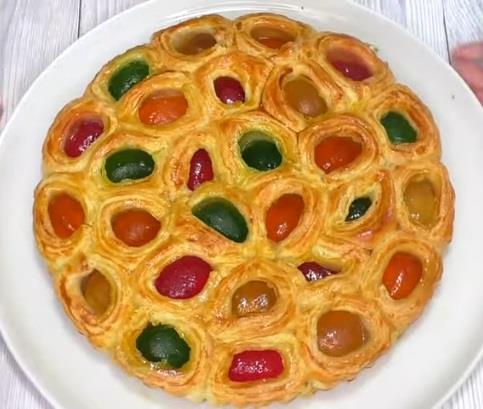U kalup za tart stavite deo lisnatog testa i malo premažite vodom, a ostatak razvucite i isecite na trake. Obmotajte trake oko svake žele bombone i ređajte u kalup. Premažite umućenim žumancetom. Pecite na 200°C nekih 30-40 minuta.