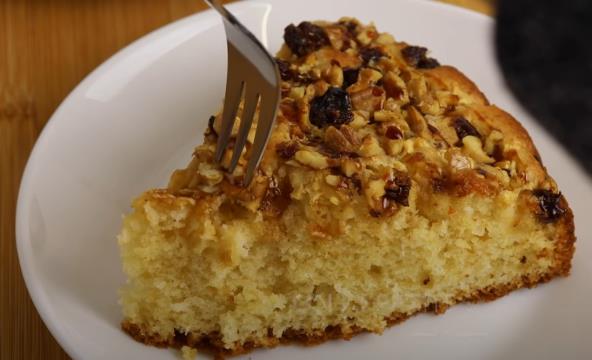 Pleh namažite puterom i malo pospite brašnom. Izručite smesu, pa preko pospite rendane jabuke. preko jabuka stavite orahe i suvo grožđe. pecite na 180 stepeni 35-40 minuta. Kada je kolač gotov dekorišite tečnim sirupom.