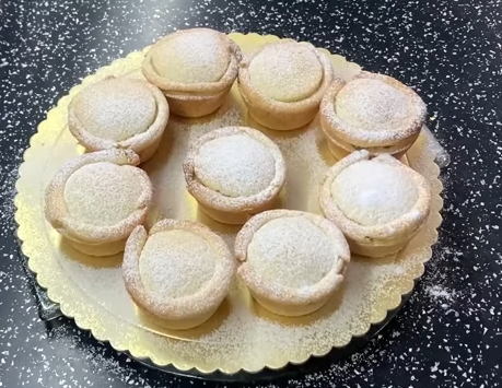 Jaja umutite sa šećerom, uljem, korom limuna i sokom od limuna. Dodajte brašni i prašak za pecivo, pa umesite testo. Stavite u foliju i ostavite u frižideru 20 minuta. Sve sastojke za fil, sem putera, sjedinite u šerpi i kuvajte dok se ne zgusne uz stalno mešanje. Pred kraj dodajte puter i kuvajte, uz mešanje, dok se ne otopi. Kalup za mafine dobro namasite i pospite brašnom. Kidajte testo i ređajte u kalup. Prstima raširite po dnu i ivici kako biste dobili korpicu. Sipajte fil preko. Ostatak testa razvucite i čašom napravite kružni oblik. Stavite preko fila. Od preostalog testa napravite tanke zimijice i obmotajte oko kruga kojim ste zatvorili mafine. Pecite na 200°C oko 25 minuta. Pospite šećerom u prahu.