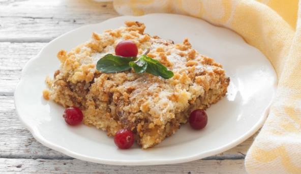 3. Odvojite 2/3 smese pa je čvrsto utisnite na dno posude za pečenje. Na to stavite kriške jabuka. U ostatak smese dodajte naseckane orahe pa je pospite po jabukama i utisnite dlanom. Pecite 30 do 35 minuta. Potpuno ohladite pre sečenja. Po želji možete posuti šećer u prahu po kolaču.