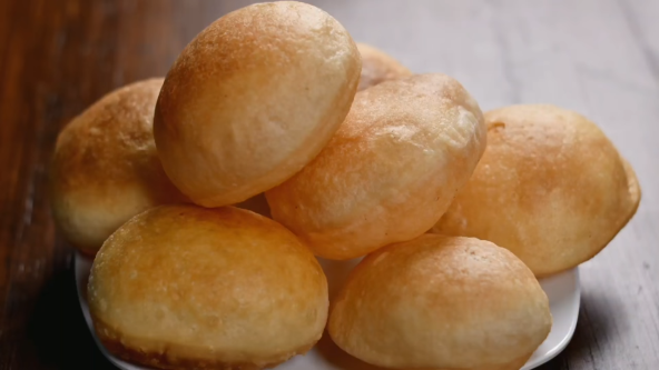 Brašno (100 g), so i šećer pomešajte, pa dodajte vodu. Dobro promešajte varjačom, pa sipajte ostatak brašna i ulje. Umesite testo, pa umotajte u providnu foliju i ostavite 20 minuta. Razvucite testo i napravite okrugle oblike kalupom. Ubacite u tiganj jedno po jedno testo. Nekoliko puta okrenite, a kada postane naduvano kao balon, pojačajte malo temepraturu i zalivajte ulje. Pržite dok ne dobije zlatno braon boju.