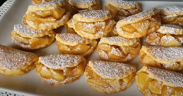 Jabuku oljuštite i očistite od koštica, pa je isecite na kockice. U plići tiganj stavite kašiku putera, dodajte jabuku, pospite je sa šećerom i cimetom. Zagrevajte na laganoj vatri, uz povremeno mešanje dok se šećer me karamelizuje. Ostavite da se ohladi, a za to vreme zamesite testo. U dublju činiju stavite celo jaje, dodajte prstohvat soli, vanilin šećer i šećer, pa lepo izmutite ručnom mutilicom. Sipajte dve kašike mleka, ponovo promešajte, pa dodajte rastopljen puter. Lagano sipajte prašak za pecivo i brašno, pa mešajte dok ne dobijete glatko testo, koje ćete potom zamesiti rukama. Razvucite što tanje oklagijom, pa okruglom modlom ili čašom vadite krugove kao za krofne. Svaki od njih napunite sa kašičicom nadeva od jabuke, pa ih lagano preklopite, ali nemojte skroz zatvarati. Poređajte ih na pleh obložen pek papirom i pecite na 180 C 15-20 minuta. Pre služenja ih po želji pospite šećerom u prahu.