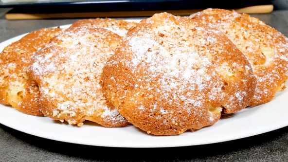 U puter sobne temperature dodajte so, šećer, vanilin šećer, pa sjedinite špatulom. Dodajte jaje i dobro umutite. Sipajte prosejano brašno sa praškom za pecivo i dobro sjedinite. Dodajte seckanu jabuku i mlevene bademe. Dobro promešajte, pa kašikom sipajte smesu na pleh obložen pek papirom. Pospite mlevenim bademima. Pecite na 180°C oko 15 minuta.