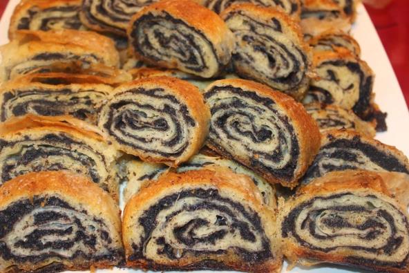 1. Umutiti sastojke za premaz. Za merenje se koristi čaša od jogurta, ali ne puna. Staviti dve kore (između prve dve kore nauljiti), na drugu koru sipati premaz. Oko 5-6 kašika je dovoljno za svako premazivanje. Staviti treću koru. Na premazanu treću koru staviti četvrtu koru i na nju fil od maka. Labavo urolati i slagati u podmazanu tepsiju.