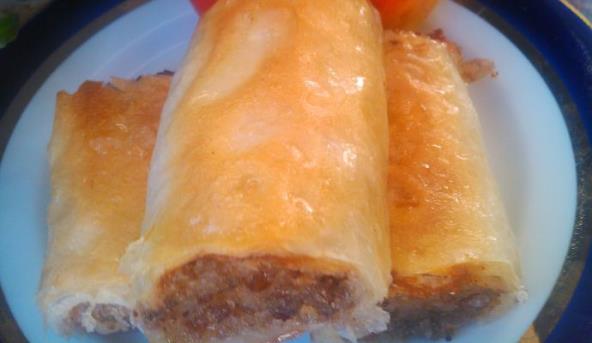 2. Spremite tepsiju 37 x 25 cm (ili bar približne dimenzije) i namažite je uljem. Raširite na stolu prvi list kore, pouljite pa stavite odozgo drugi, a zatim i treći na koju će te po širini na dnu stavljati kašikom gotov pripremljen fil. Rolajte baklavu i tako do kraja dok ne utrošite sav fil. Kad ste sve završili, isecite rolnice na krupnije komade, pa je zalijte sa malo vrelog ulja (da zacvrči) kako ne bi iscureo fil prilikom pečenja.