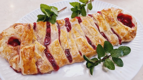 Krem sir, šećer u prahu i aromu vanile umutite. Lisnato testo malo rastanjite oklagijom (stavite ga odmah u pleh na pek papir), pa uzdužno po sredini razmažite fil. Preko stavite višnje. Sada testo koje nije pokriveno filom zasecite sa obe strane praveći proreze debljine oko 1 cm, pa preklapajte naizmenično preko dela gde je fil. Formiraćete pletenicu. Premažite jajetom, a kada se ispeče namažite glazurom, koju ste napravili mešavinom mleka i šećera u prahu.