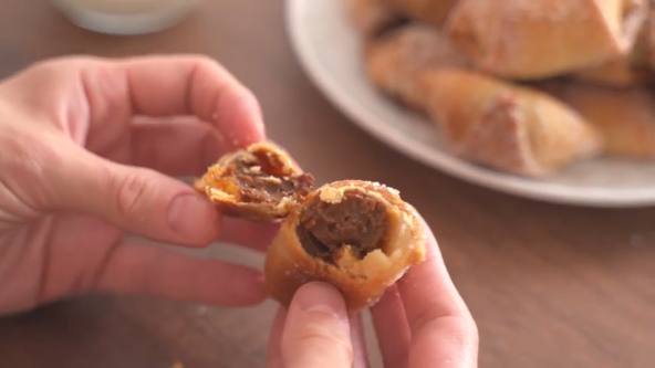Razvaljajte testo, isecite na 8 delova. Stavite 1 kašičicu kuvanog kondenzovanog mleka na svaki deo testa i umotajte. Uvaljati u šećer.