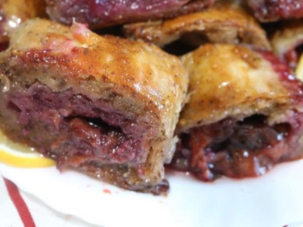 Šljive očistite od koštica, isecite na četvrtine, pa ih stavite u dublji tiganj ili šerpu. Dodajte maslac i šećer i sve zajedno upržite da voće pustu sok i omekša. Kada šljive budu gotove dodajte im cimet i limunovu koricu. Jednu koru premažite uljem, pa odozgo stavite drugu koru, a zatim u jedan kraj rasporedite nadev sa šljivama. Pospite ih prezlama, pa lagano zamotajte. Postupak ponovite dok ne potrošite sav materijal. Pite ređajte u pleh obložen pek papirom, pospite ih smeđim šećerom i pecite u rerni zagrejanoj na 200 stepeni oko 20 minuta.