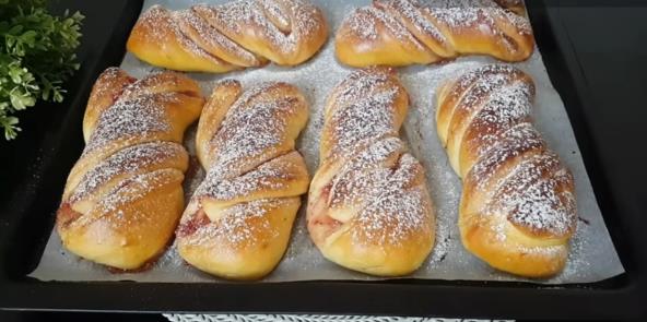 U činiji pomešajte mleko i vodu, dodajte vanilin šećer i šećer, zatim kvasac i ulje. Odvojte belance od žumanceta, pa belance ubacite u činiju i sve mutite da se sastojci lepo povežu. Dodajte brašno, pa zamesite glatko testo. Malo ga obradite rukama, tako da počne da se odvaja od zidova činije. Dodajte kockicu putera, pa ponovo premesite. Pokrijte folijom i ostavite sat vremena da naraste. Testo razvucite oklagijom na debljinu oko 1 cm. Celom dužinom ga premažite džemom od jagoda, pa preklopite ivice. Isecite na 8 jednakih delova. Svaki komad zavijte po sredini tako da dobijte spiralu. Poređajte pecivo u pleh obložen pek papirom i ostavite da "odmori" oko 15 minuta. Premažite žumancetom i pecite u rerni na 180 stepeni oko 20 minuta. Kada se pecivo prohladi pospite ga šećerom u prahu.