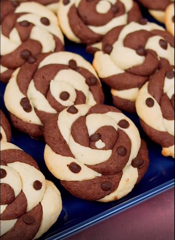 Zagrejte rernu na 160 stepeni. Umutiti jaje sa otopljenim puterom, šećerom i mlekom. U posebnoj posudi pomešajte brašno sa praškom za pecivo, valinin šećerom i dodajte malo soli. Dodajte mokre sastojke u suvu mešavinu i promešajte da se sjedine. Podeliti testo na dva dela. U jednu polovinu dodajte 20 g brašna i dobro promešajte. U drugu polovinu dodajte kakao prah i ponovo mešajte dok se ne sjedini. Svaku polovinu testa isecite na male delove i svaku urolajte u kuglu. Svaku kuglicu zarolajte da formirate štapiće. Uzmite 2 štapića različitih boja i ispletite u pletenicu. Umotajte pletenicu u oblik puža i pričvrstite slobodni kraj. Stavite kolačiće na pleh obložen pek papirom i ukrasite ih čokoladnim komadićima. Pecite 20 minuta dok ne dobiju lepu rumenu boju. Pecept i pripremu pogledajte u videu u nastavku teksta.